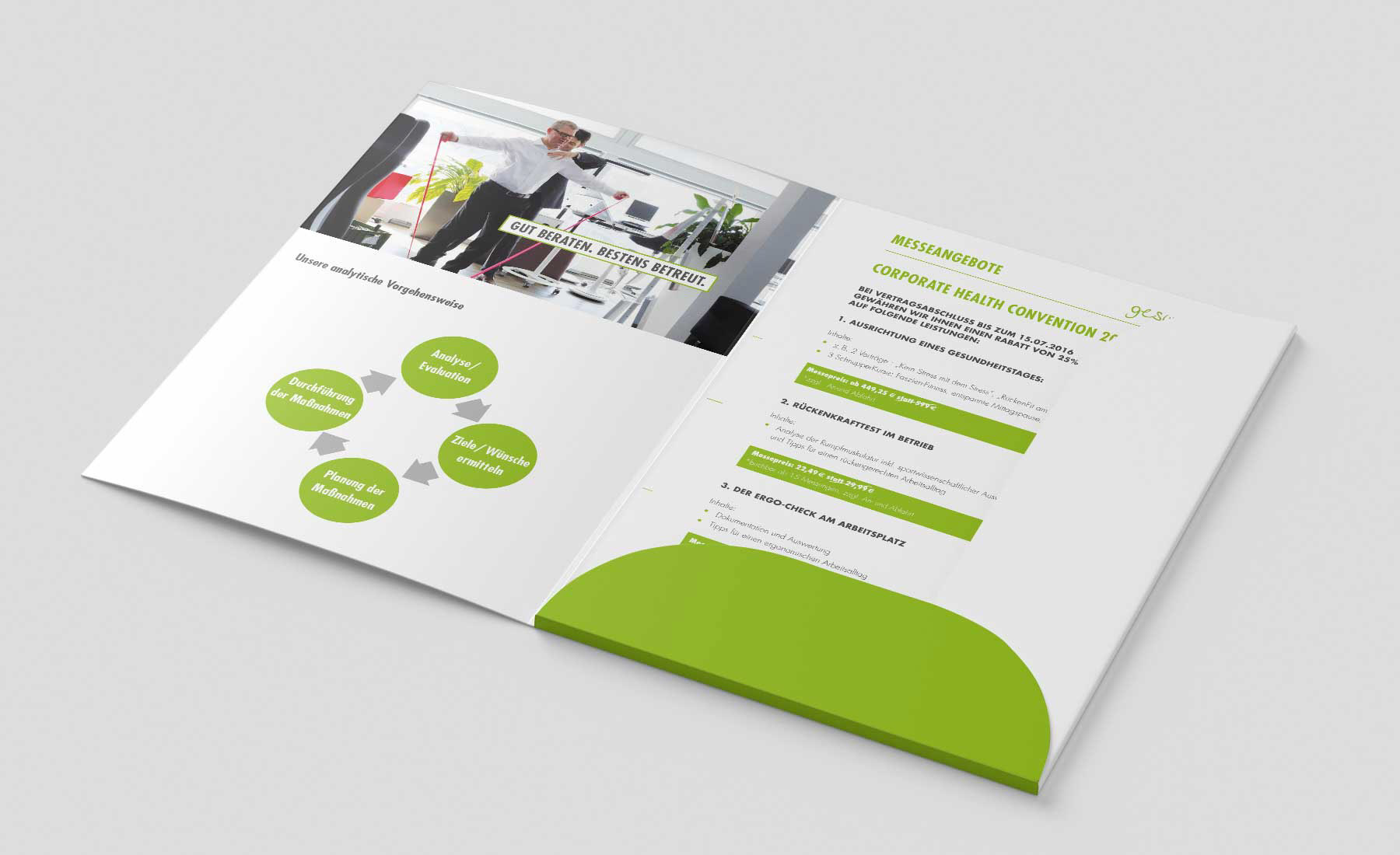 Corporate Design Entwicklung, Broschüren und Messematerialien für die Initiative gesundarbeiten der Physiocentrum Fündling GmbH
