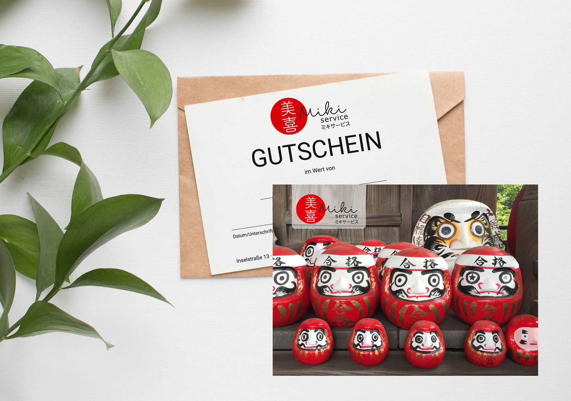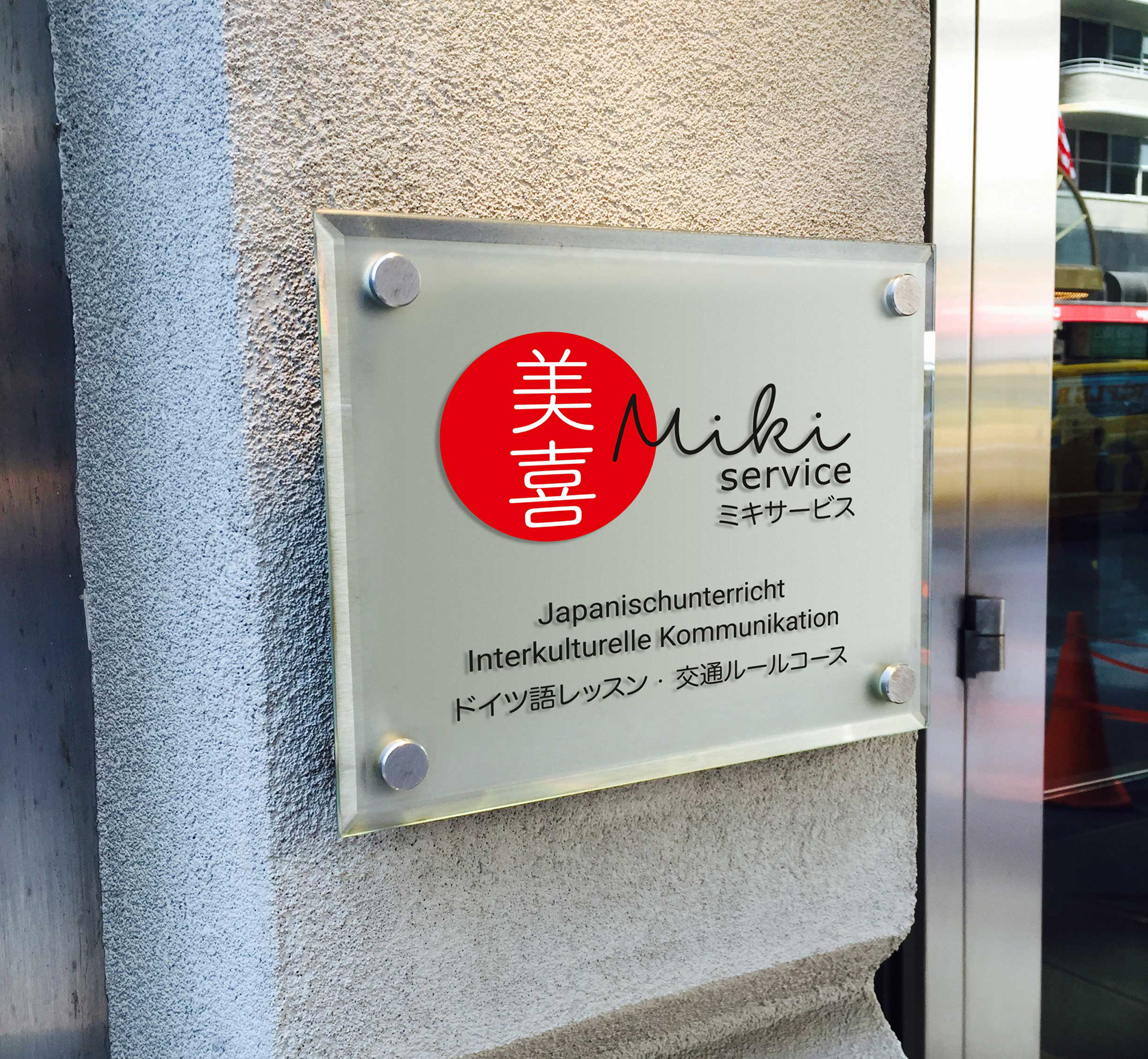 Corporate Design für Miki Service, Japanischunterricht und interkulturelle Kommunikation in Düsseldorf. Logoentwicklung, Visitenkartendesign, Gutscheingestaltung und Beschilderung